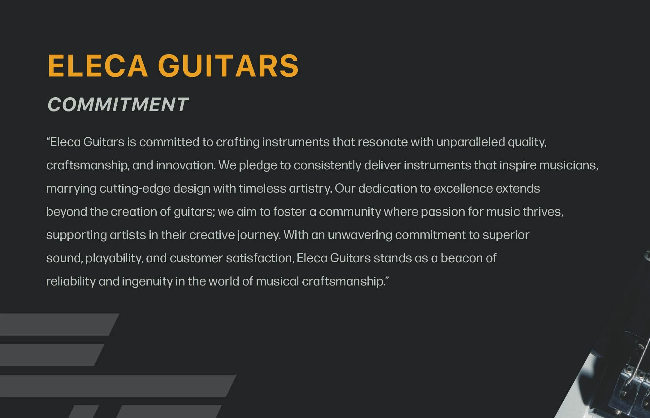 Eleca Guitars represents the next evolution of Eleca Amps, with a clear focus on elevating local musicians and bringing light to their careers in the competitive music industry. The brand cuts through the noise by infusing fast-paced, dynamic sports branding language with the classic elements of traditional guitar branding. This combination creates a distinct and appealing brand identity that particularly resonates with and draws in younger players who are looking to begin their musical journey.
